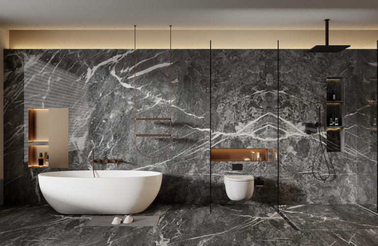 使用铅笔灰大理石可以提供鲜明的对比,增加空间的深度和层次感;